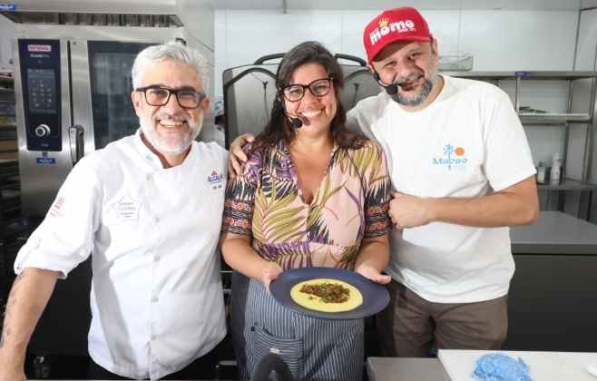 Na Cozinha Show, os chefs Mari Rezende, do Bar da Frente, na Praça da Bandeira e em Copacabana (eleito o Melhor Bar do Rio no prêmio Rio Gastronomia 2025) e Toninho, do Bar do Momo, na Tijuca (consagrado Patrimônio Cultural Carioca, em 2022, e vencedor por seis vezes seguidas do prêmio Água na Boca Tijuca do Jornal O Globo) prepararam uma polenta com Carne de Vó do Bar do Djalma, de Macaé. A receita de peito bovino desfiado é do chef Hugo Dias, que herdou o bar, em Córrego da Pedra, do sogro.