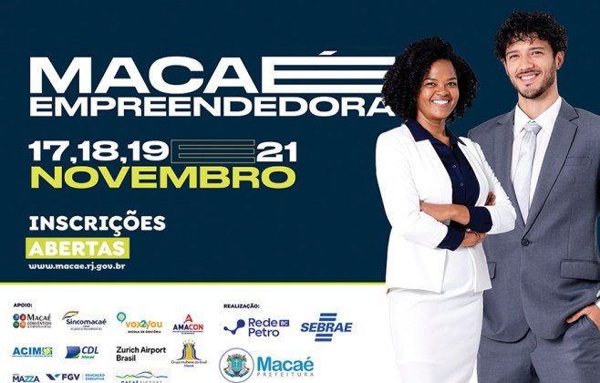 Começaram nesta sexta-feira (31) as inscrições para a terceira edição da Semana Macaé Empreendedora, que será realizada nos dias 17, 18, 19 e 21 de novembro em pontos descentralizados da cidade. O evento é uma realização da Prefeitura de Macaé com a Redepetro-BC e o Sebrae e apoio da FGV, Zurich Airport, Grupo Mulheres do Brasil, Amacon, Acim, Cdl, Sinco Macaé e Vox To You. As inscrições podem ser feitas no link https://forms.office.com/r/APza4mWUVC.
