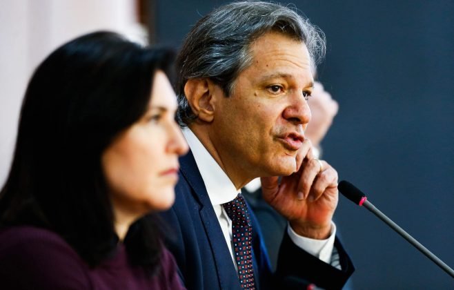 Os ministros Simone Tebet (Planejamento) e Fernando Haddad (Fazenda), durante entrevista coletiva depois de apresentarem ao presidente Lula o quadro fiscal do país – 17/06/2024 | Foto: Wilton Junior/Estadão Conteúdo